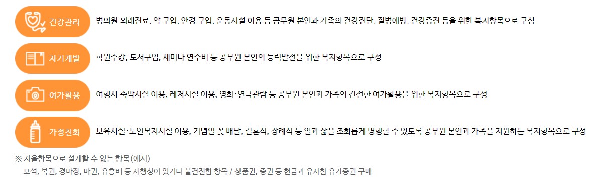 대부분 본인과 본인의 가족까지 이용할 수 있지만 자기계발 비용은 본인에 한해서만 이용이 가능합니다. 복지포인트의 사용 항목은 크게는 2가지이며 기본항목이 필수와 선택으로 나눠져 3가지로 나눠질 수 있습니다.
