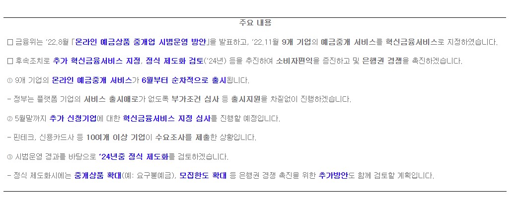 아래는 온라인 예금상품 중개서비스에 대한 보도자료입니다.