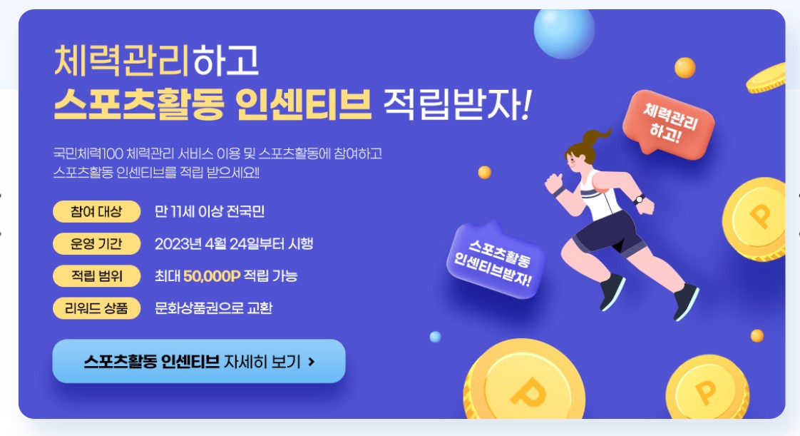 만 11세 이상이시라면 누구나 받으실 수 있는 운동지원금이 있습니다. 회원가입만 해도 1만원 문화상품권을 지급받으실 수 있으시며 회원 가입 후 정부에서 지정한 운동 센테에서 운동을 하시면 5만원을 받을 수 있으니 신청하시기 바랍니다.