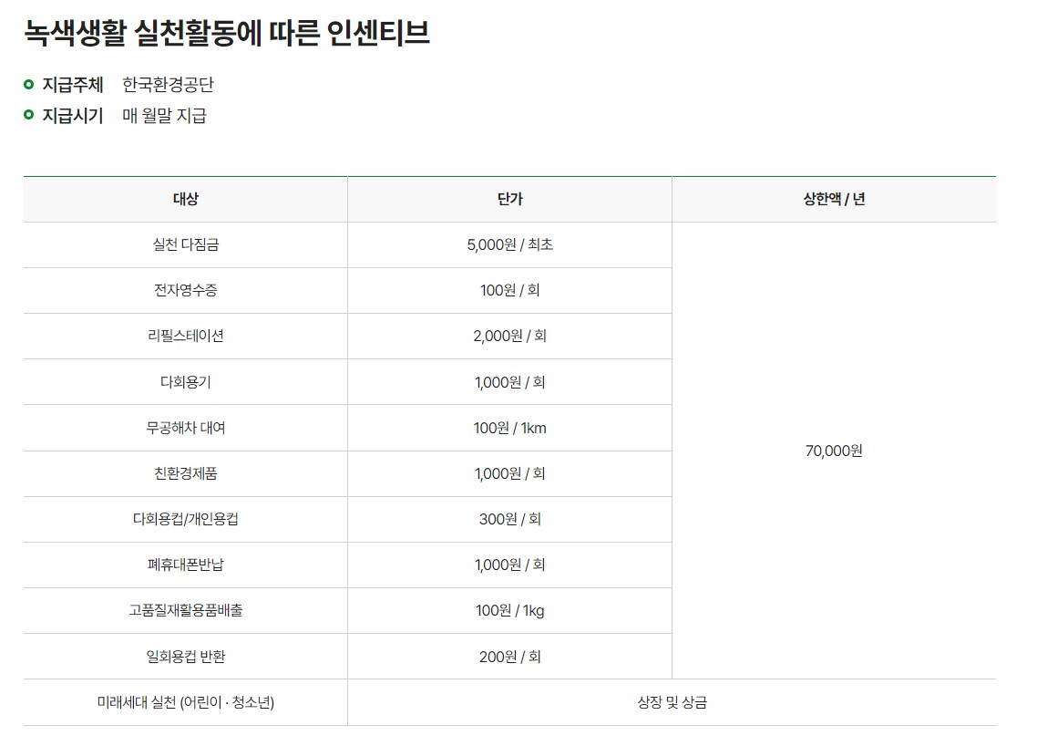 탄소중립 실천 포인트 제도의 인센티브를 받기 위해 할 수 있는 항목과 각각의 항목별로 받을 수 있는 금액입니다. 처음에 가입만 하여도 실천 다짐금으로 5천원을 지급받으실 수 있습니다. 모든 활동에서 받으신 지원금을 합하여 1년간 총 7만 원까지 인센티브를 지급받으실 수 있습니다. 인센티비는 매월 한국환경공단에서 지급한다고 합니다.