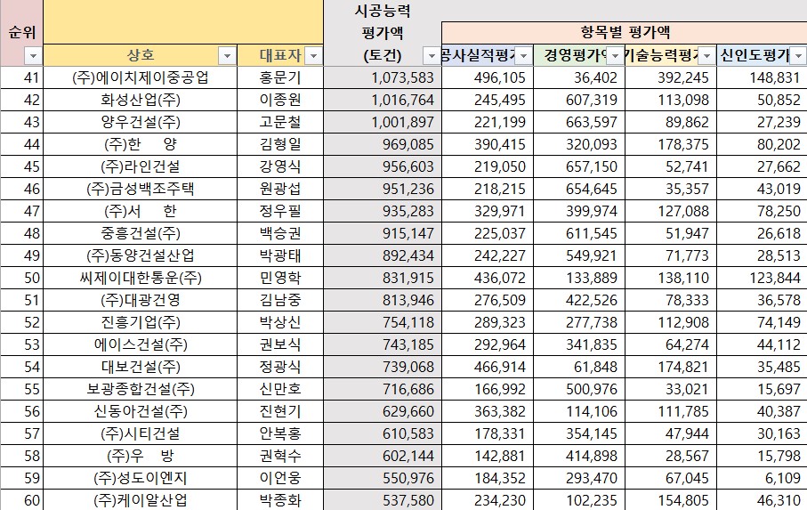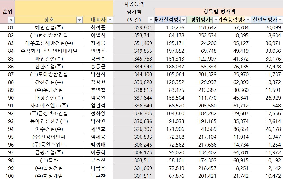 100위까지 국내 시공사 순위를 추가적으로 알아보겠습니다.