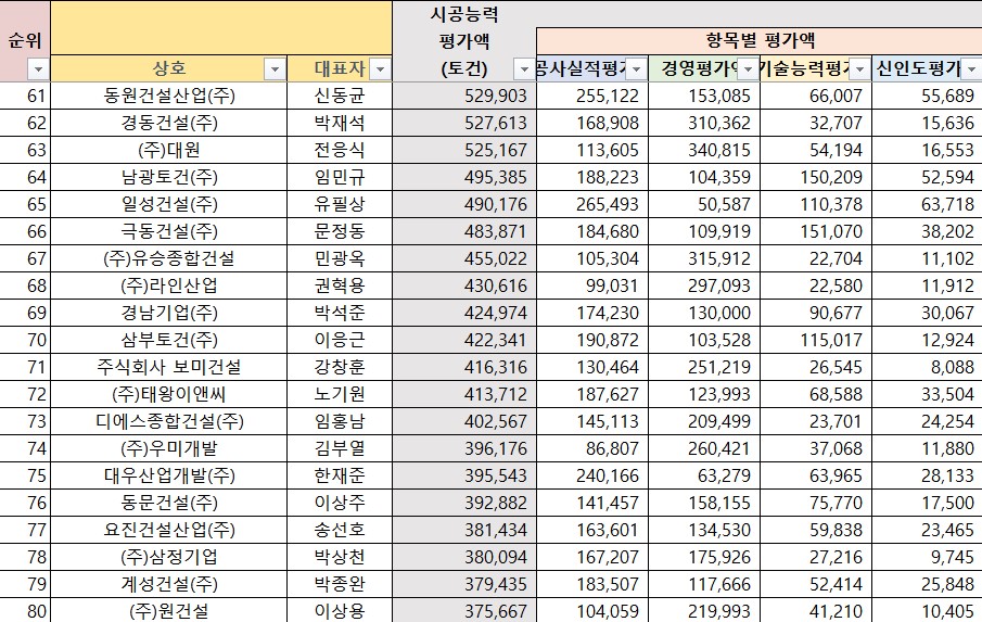 도급순위는 전국 건설 업체를 대상으로 공사실적, 경영상태, 기술능력 등을 종합적으로 평가하여 발주자가 적절한 건설업체를 선정할 수 있도록 국토교통부에서 매년 공시하고 있는 자료입니다.