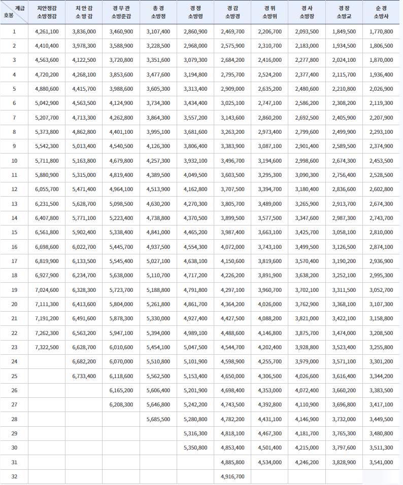 경찰공무원 봉급표는 소방공무원 봉급표와 동일합니다. 경찰공무원의 경우 군대 면제 대상인 분은 순경 1호봉부터 군대를 다녀오신 분은 순경 3호봉부터 시작합니다. 순경 3호봉을 기준으로 기재된 금액은 1,870,00원으로 전년도에 대비하여 54,000원의 금액이 인상되었습니다.
