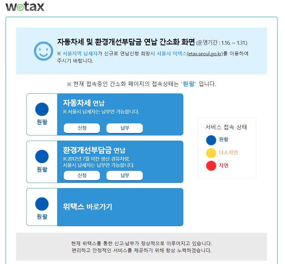 자동차세를 조회하는 방법은 간단합니다. 포털 사이트에 위택스를 검색하시고 접속하시면 자동차세와 납부 기간을 손쉽게 확인하실 수 있습니다. 서울시의 경우 인구가 많아 위택스만으로 진행하기 어려워 자동차세 납부 앱을 활용하여 납입이 가능합니다. 사시는 지역에 따라 사용하는 앱은 다르기 때문에 꼭 확인해 주시기 바랍니다.